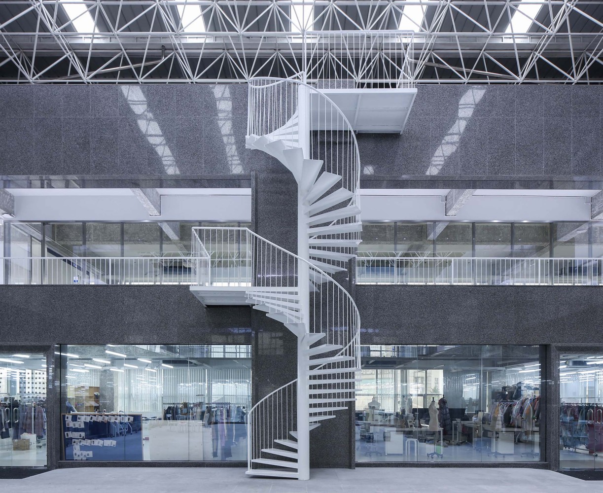 设计将原厂房的服装生产车间与行政办公室打造为一座现代时尚工作室与灵活办公场所的集合体。原有的饰面材质则被完全拆除,裸露出最原始的水泥和砖墙。设计引入了水磨石、软膜天花、半透明镜面玻璃,白色粉末涂层钢等新的高品质材料,与保留下来的原有材质形成对比,在改造后的建筑空间内形成新与旧、传统与现代的对话。