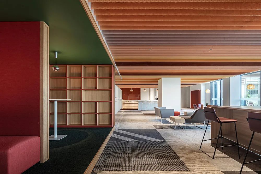 △ 协作区作为工位组团之间软质间隔,用地铺和天花造型强调空间属性